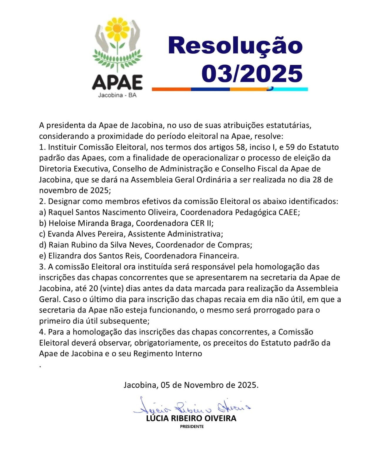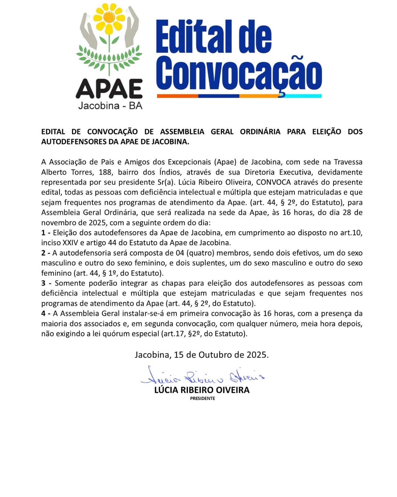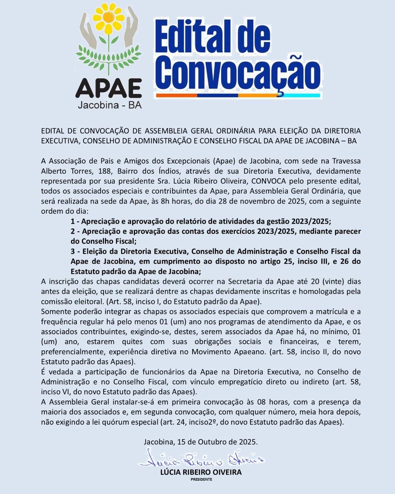 Cumprindo sua Agenda Estatutária, a APAE de Jacobina publica seu Edital de Convocação de Assembleia Geral Ordinária para Eleição dos Membros da Diretoria Executiva, Conselho Fiscal 2026/2028.